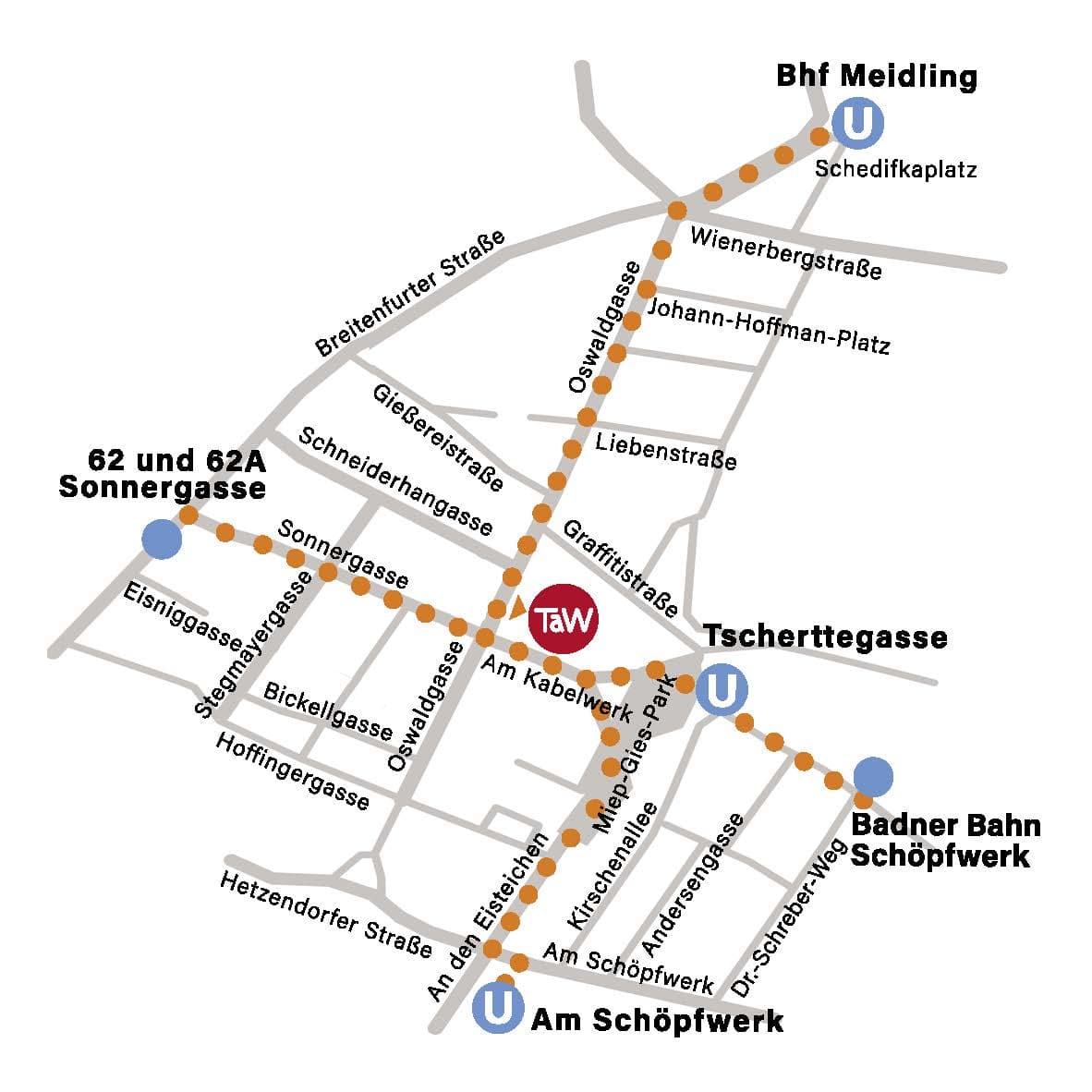 Erreichbarkeit: U-Bahn-Linie U6 (Tscherttegasse), Straßenbahn-Linie 62 (Sonnergasse).