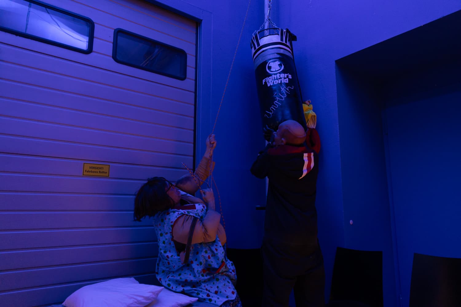 An drei Abenden ( jeder anders als der andere!) erwartet das Publikum eine künstlerische Collage aus Raum, Bild und Performance, die große Themen mit Mut zur pathetischen Selbstzerstörung wortwörtlich abklopft. Der einsame Kampf des Einzelnen gegen sich selbst steht oft im Zentrum. Die Bühne vereint Elemente eines Zoos, einer Sporthalle und eines Bierzelts – ein Ort, an dem die Performer*innen sowohl körperlich als auch emotional an ihre Grenzen stoßen und „ihr Fett abkriegen“.
